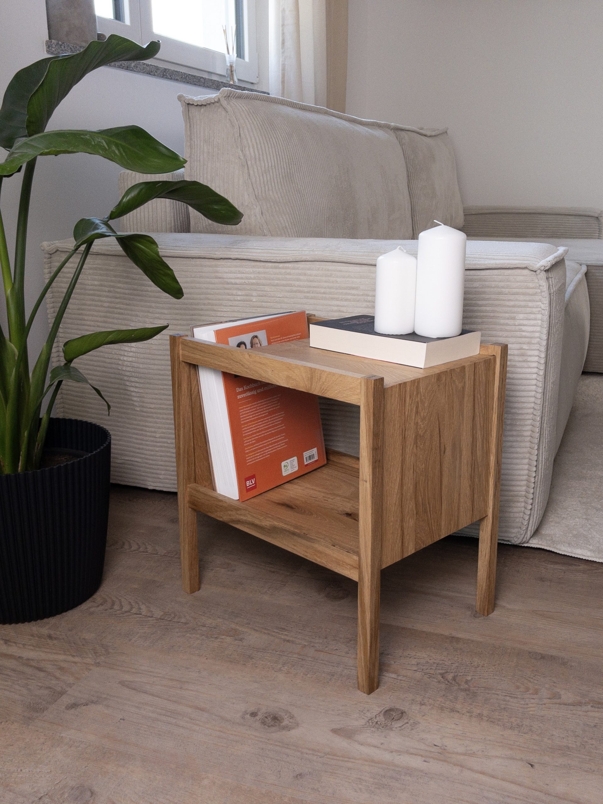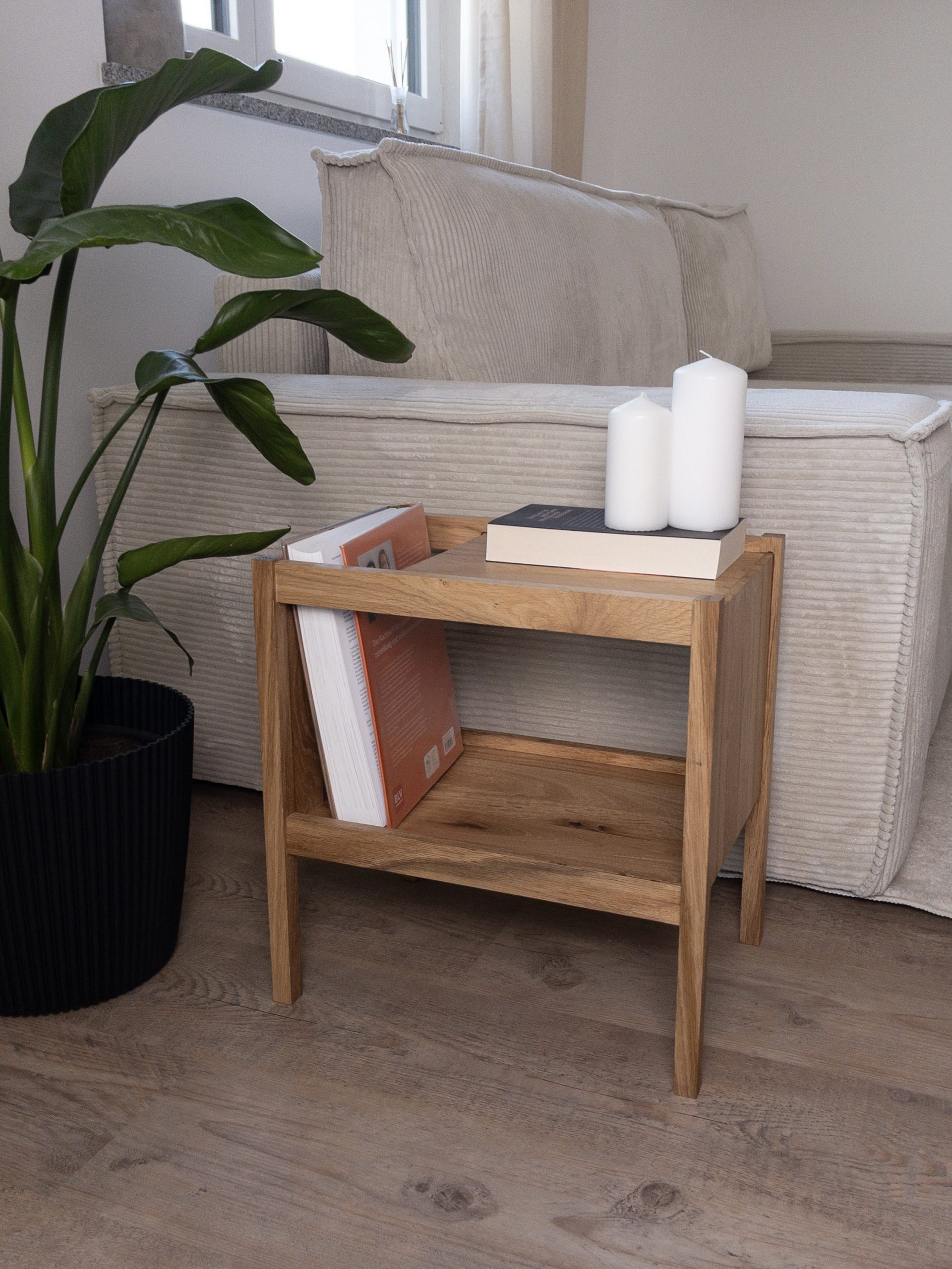 Handgefertigter minimaoistischer Beistelltisch aus Eiche. Ein absoluter Hingucker in jedem Wohnraum.