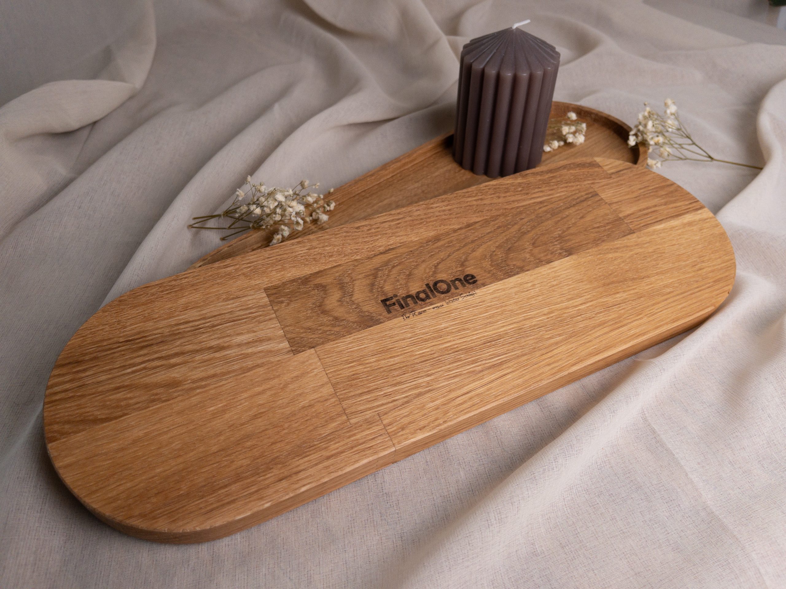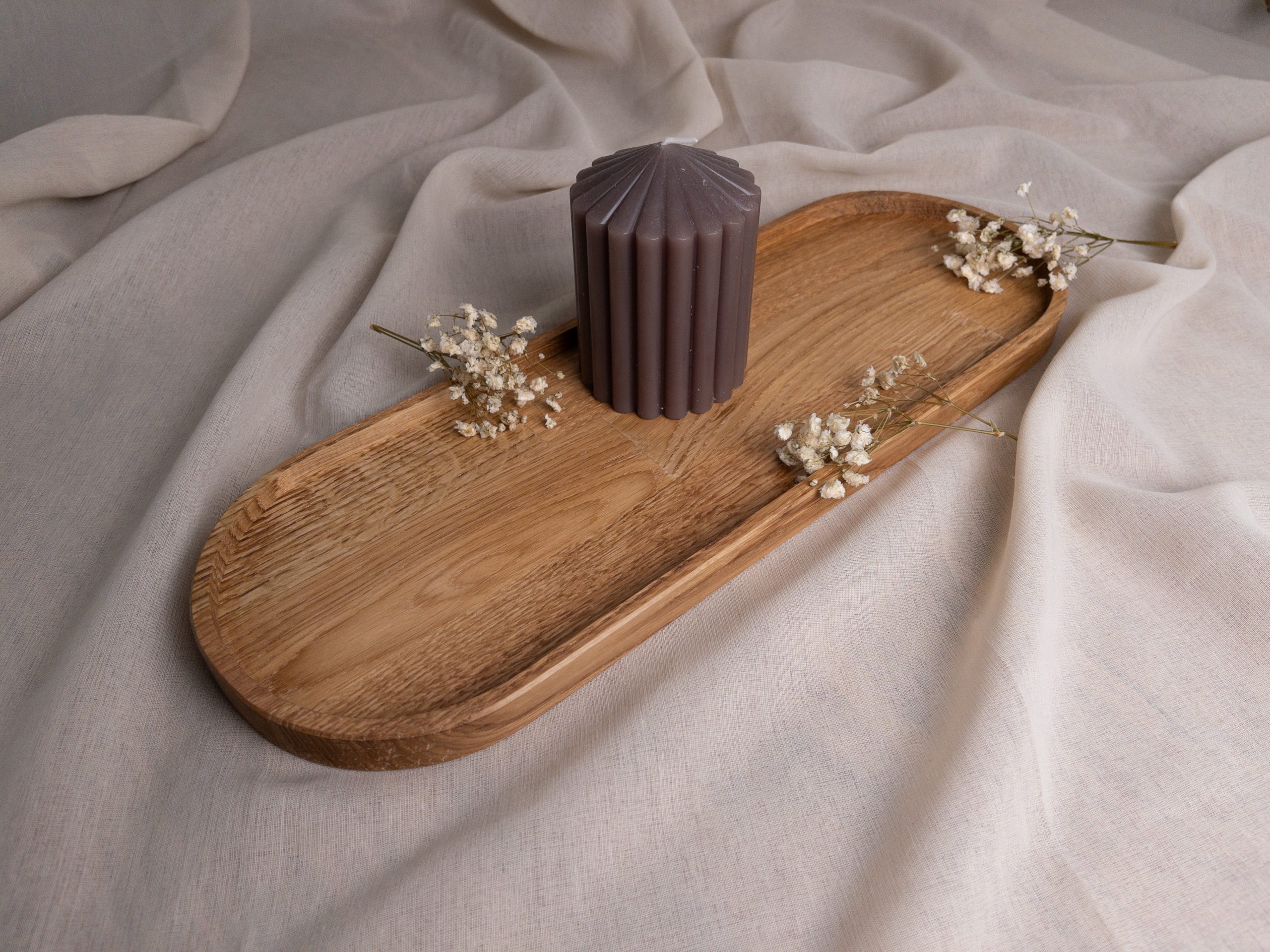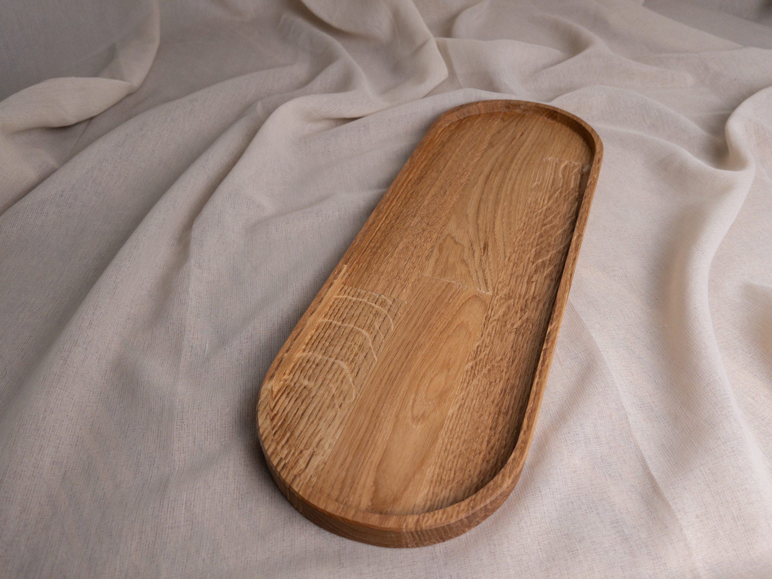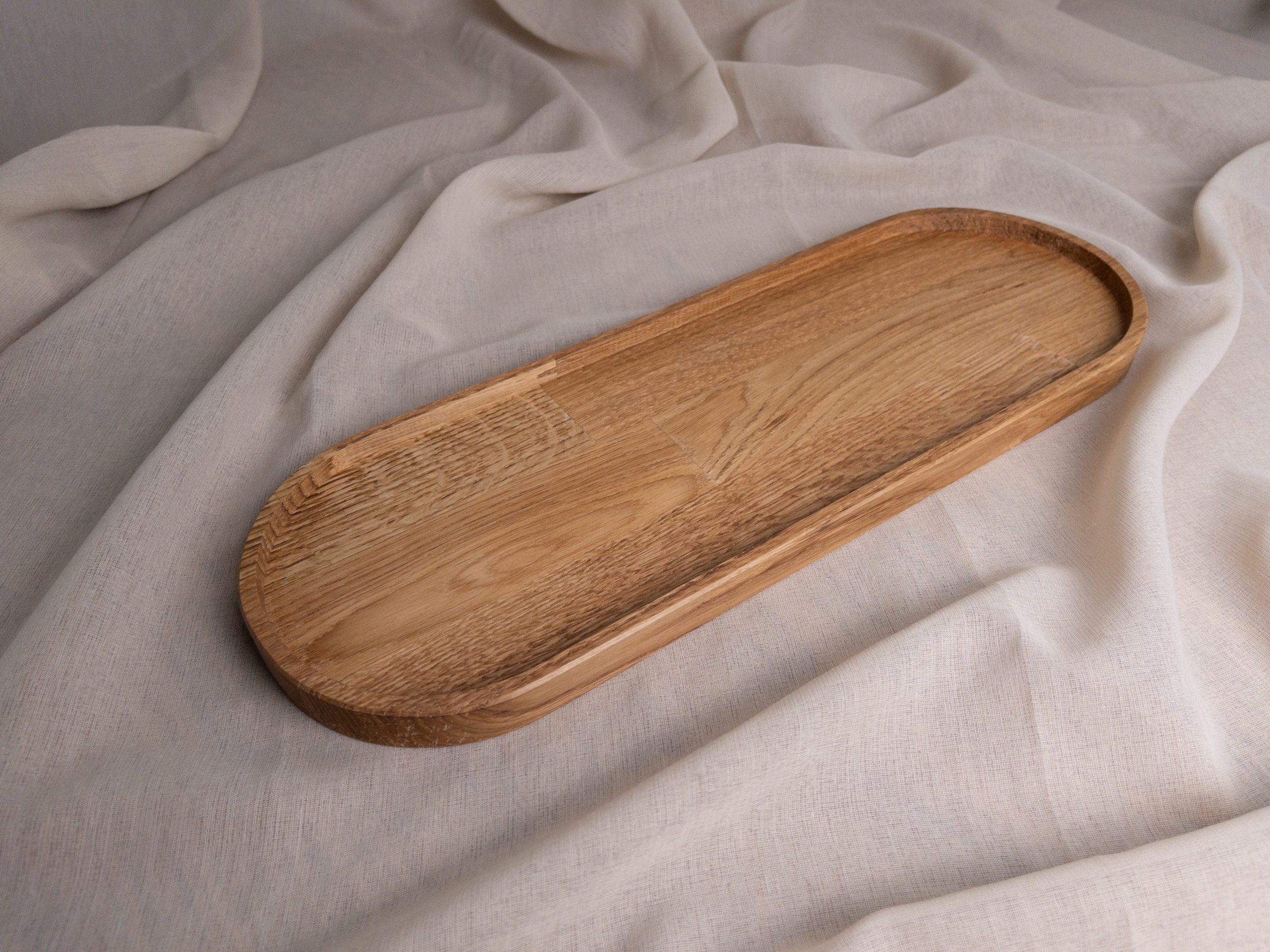 Diese stilvolle und vielseitige Servier- oder Dekoschale aus massivem Eichenholz ist ein echtes Unikat und wird sorgfältig von Hand gefertigt. Die Schale misst 14 x 40 cm, wobei die kurzen Seiten elegant halbrund gestaltet sind, was ihr eine ovale Form verleiht. Mit einer dezenten Vertiefung von etwa 8 mm im Inneren eignet sie sich ideal für vielfältige Verwendungszwecke.