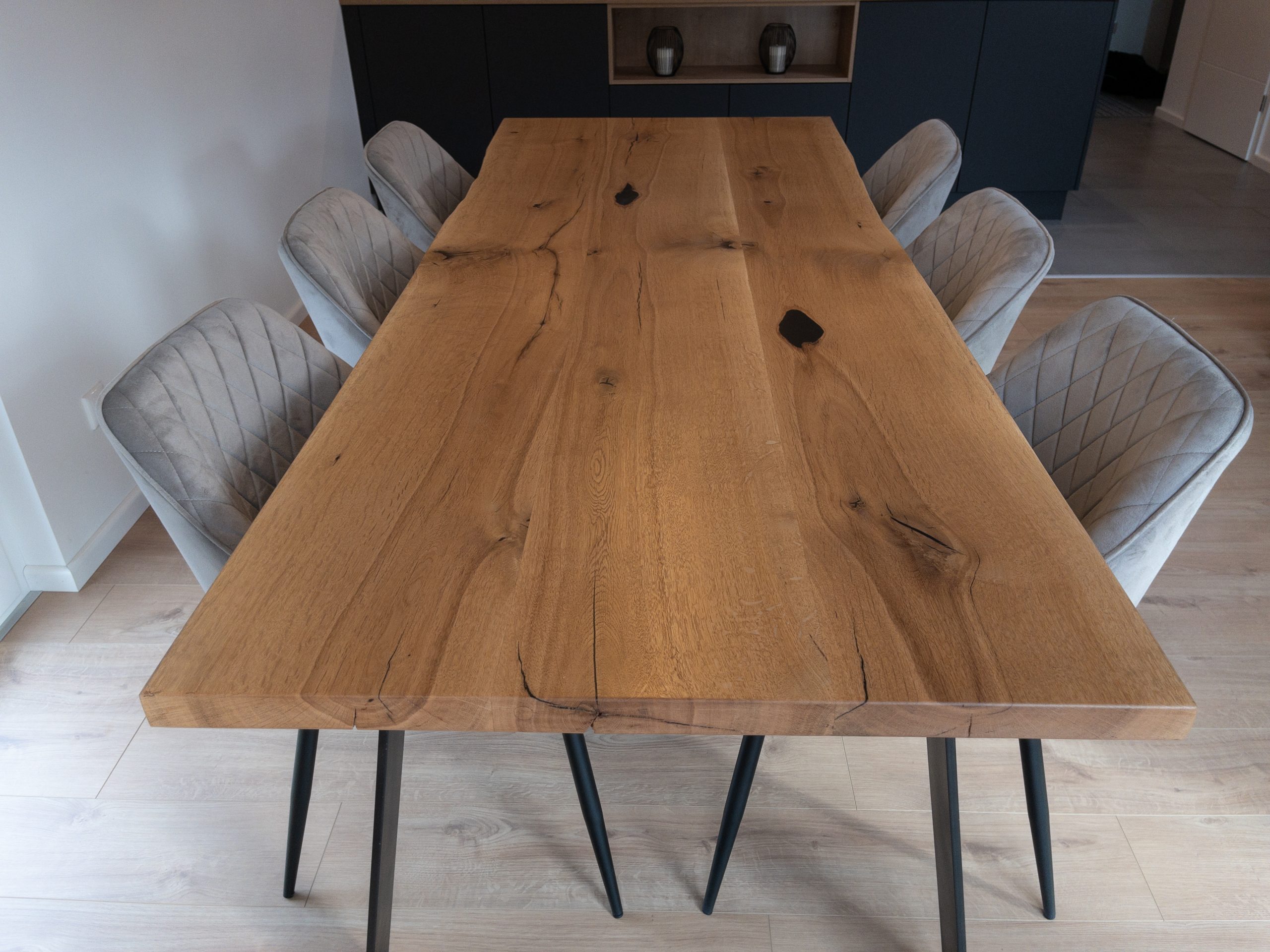Esstisch aus massiver Eiche aus 3 massiven Eichenbohlen vom gleichen Stamm gefertigt.