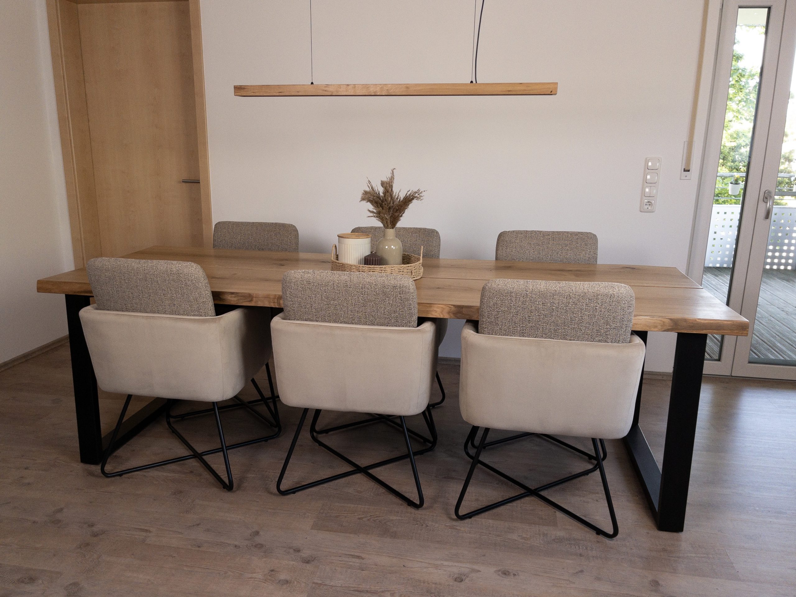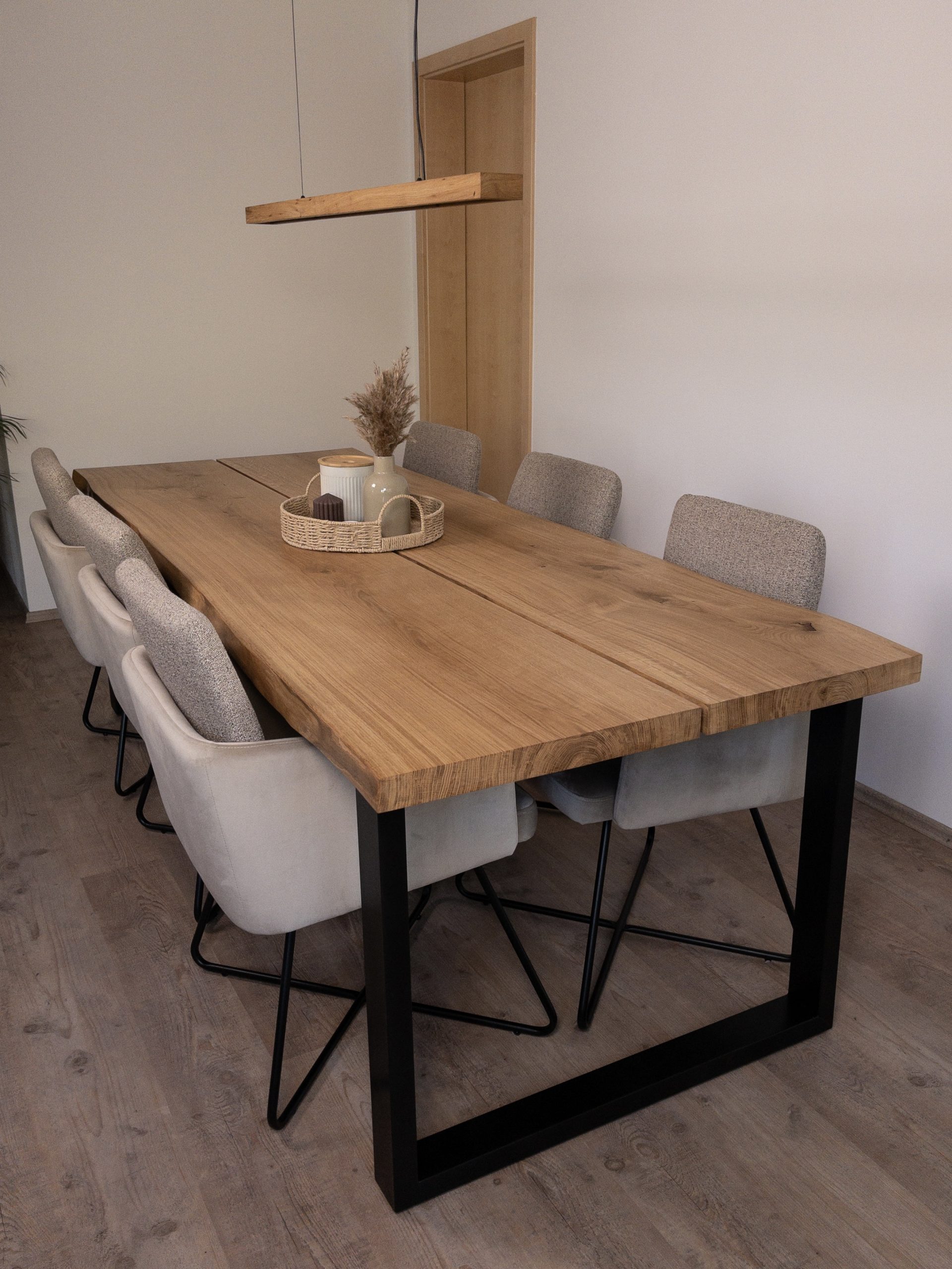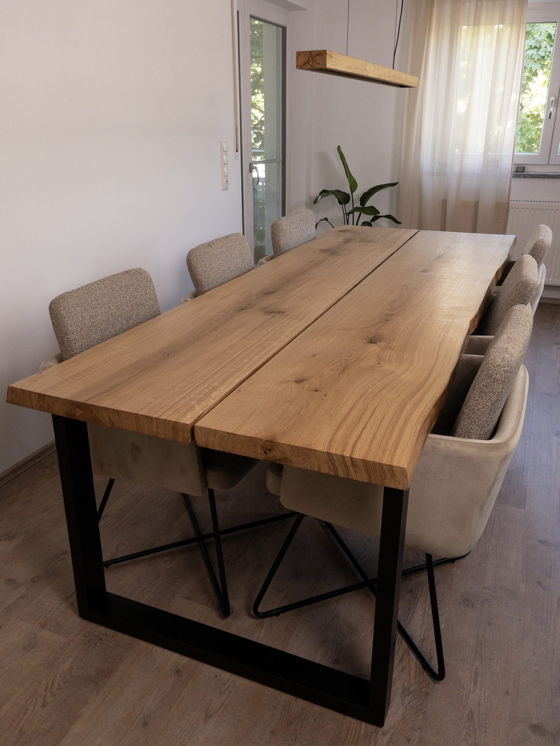 Esstisch aus zwei massiven Eichenbohlen vom gleichen Stamm gefertigt.