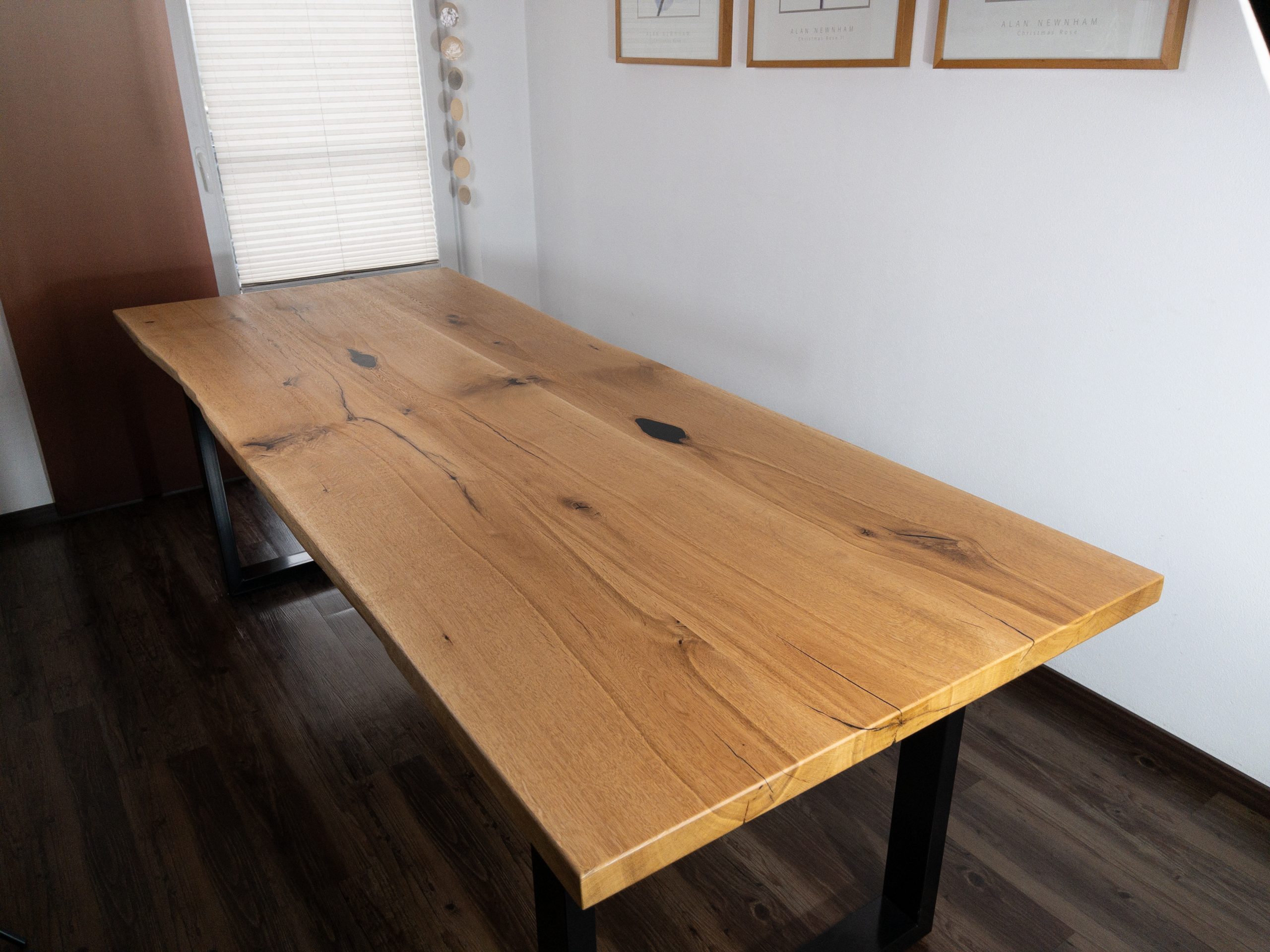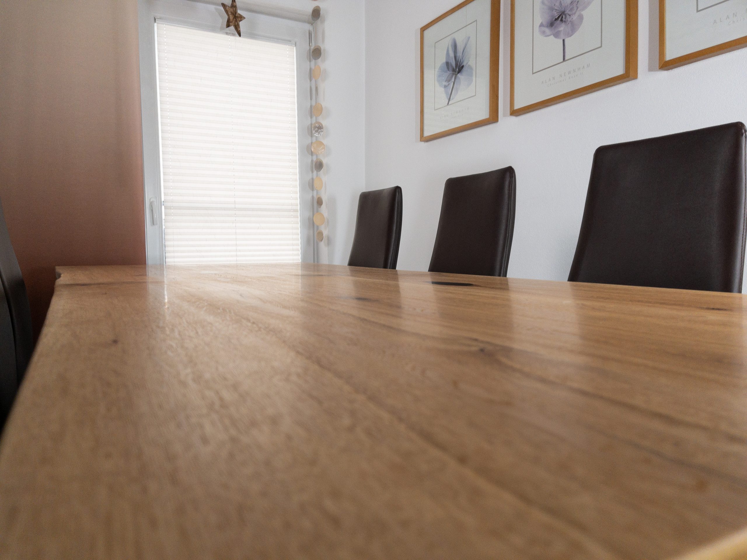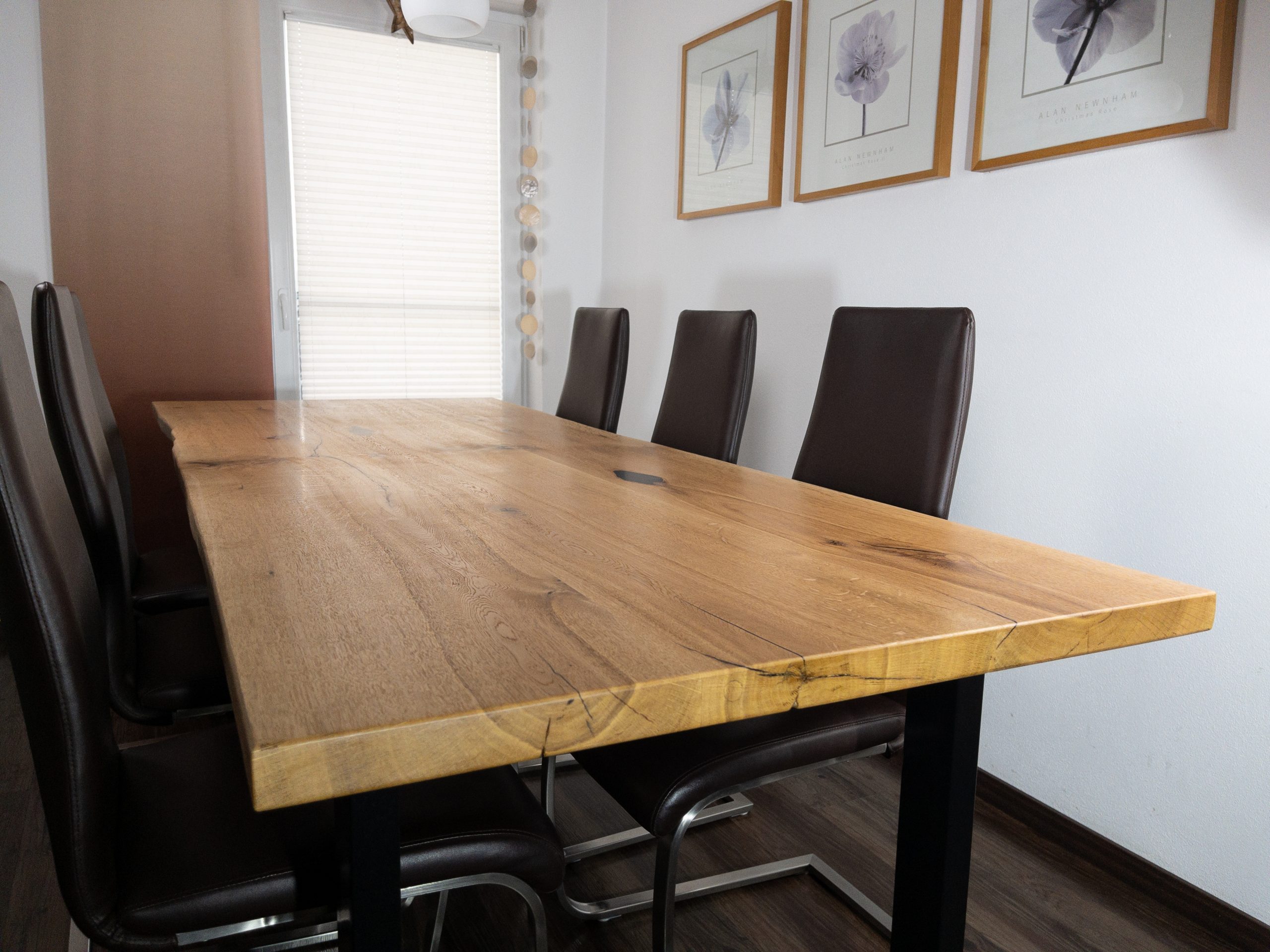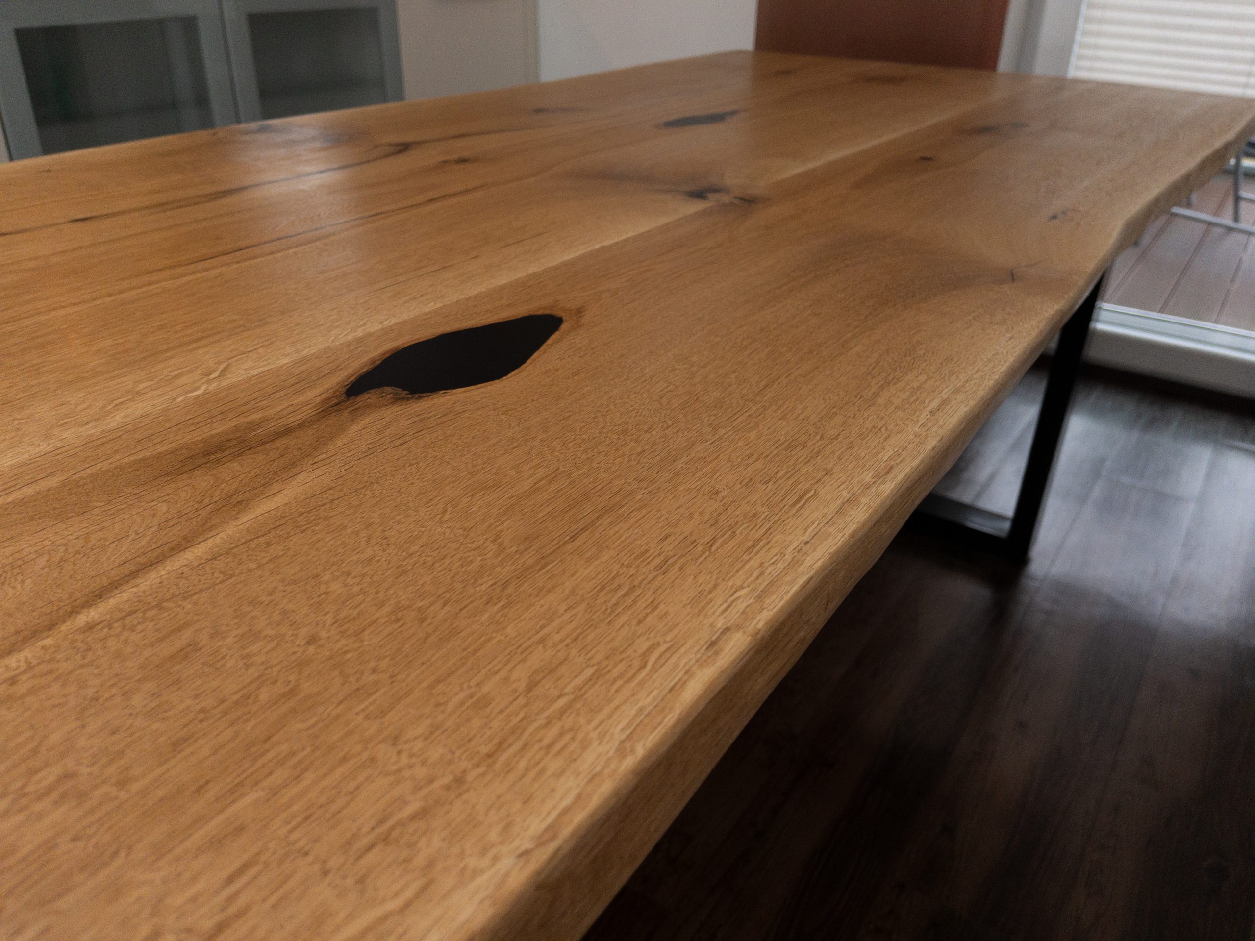 Esstisch aus massiver Eiche aus 3 massiven Eichenbohlen vom gleichen Stamm gefertigt.